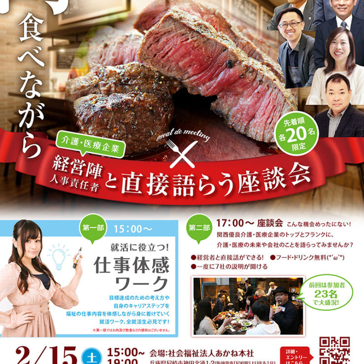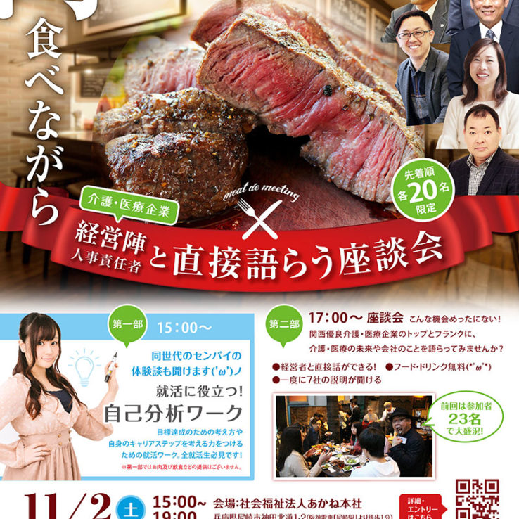 採用同盟では、食事会スタイルで経営者や人事責任者と気軽に話ができるイベントを定期的に開催。学部や専攻に関わらず、気軽に、かつ奥深く、介護・医療業界を知ることができるイベントです。業界研究・仕事研究としても有効です。